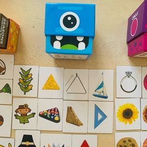 Helps name places, items, shapes, seasonal items, build independence, and finger grip.
