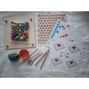 This is a Toddler sorting set with colorful wooden balls, matching silicone cups to sort, photos to complete with a matching wooden holder and chop sticks and spoon to help hand - eye coordination and concentration.