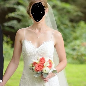 Stunning, elegant dress worn only once summer 2016 and immediately cleaned and persevered-in excellent condition. Size 8 (fits more like 6) ivory over nude with minor alterations done by couture seamstress. Plenty of room in hips so could be taken in for someone less curvy. The dress drapes over the body beautifully and there is freedom of movement, cool for hot days. Two ways to wear the optional bustle. Custom made veil happy to throw in for free. 5'6 and wore 2-3 inch heels.