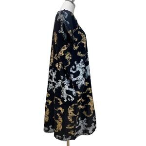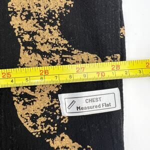 Preowned item in excellent overall condition. No odors, stains, or holes. Gold and silver metallic printed abstract art. Boxy fit.