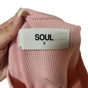 This Soul Cycle tee in baby pink is perfect for any season. With a classic/fitted sleeve and a round neckline, it features a pullover closure and is made of spandex and cotton material. The long sleeve tee is designed with a solid pattern. It's a regular fit and available in size S (T52). The garment care instructions recommend hand wash only. This tee is a basic style top that can be paired with any bottoms. Perfect for women, it is not vintage and is from the SoulCycle brand. Gently used, no flaws. Comes from an animal-free and smoke-free home.