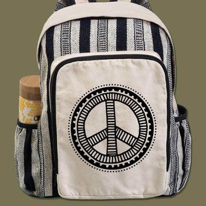 Every time you use this Peace Symbol Backpack, may you spread a message of PEACE, love, and happiness. Stay in peace with its two zip compartments, two side pockets, and peace symbol graphic. Complete with a heavy cotton fabric to carry all of your favorite things. Ethically made in Nepal, hand screen printed in Minneapolis. 15 x 17 inches with adjustable straps. Natural.
