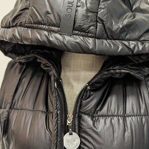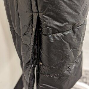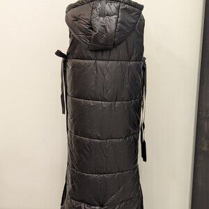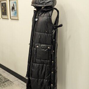 Long black vest to keep the cold out! Two pockets on the front, hood and snapped sides