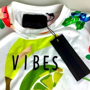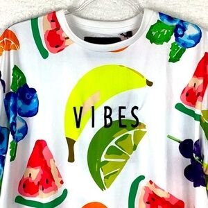 NWT SoulStar England Vibes Unisex Fruit Tee Shirt, Size X-Large. High / Low. 100% Polyester. Perfect For Summer Get Togethers, Boating, Parties. Bright and Vibrant Colors. Multitude of Fruits.