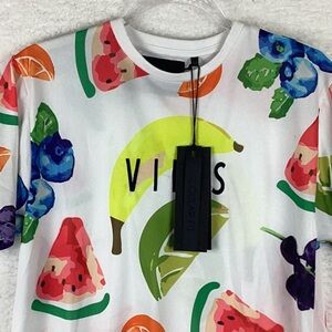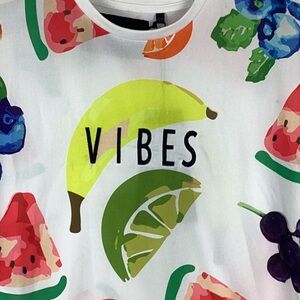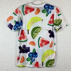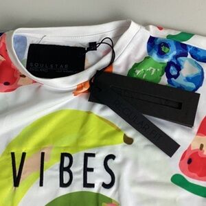 NWT SoulStar England Vibes Unisex Fruit Tee Shirt, Size Small. High / Low. 100% Polyester. Perfect for Summer, Boating, Party. Bright and Vibrant. Multitude of Fruits.