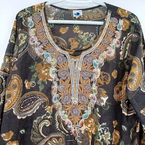 Soula Floral Paisley Embroidered Beaded Embellished Tunic Top Longline Scoop Neck 3/4 Sleeves Flowy Relaxed Fit Lightweight Breathable Women's