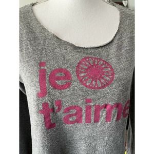 Soulcycle Je T’aime Grey Pullover Knit Long Sleeve Mesh Workout Sweatshirt. This sweatshirt features a round neckline, long sleeves and Je T’aime spelled out large across the chest areas. The back is completely sheer and breathable knitted mesh. Intentionally made to look a bit distressed with the rolled raw hems. Comfy, fun and unique!