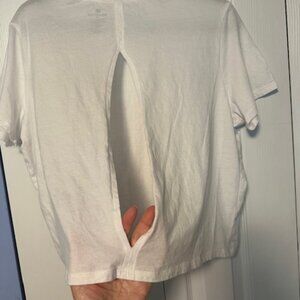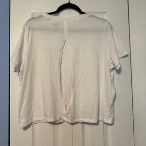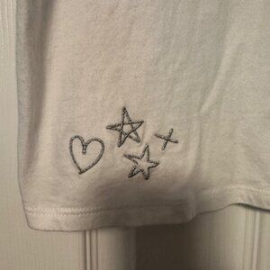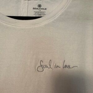Soulcycle white T-shirt with silver embroidery saying Soul in Love and heart and stars on bottom left. Back has open slit. Size L. In perfect condition.
