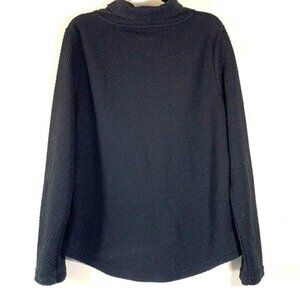 Souluxe black textured roll neck sweater with long sleeves, a scalloped hem in back, and a straight hem in front. Size M. Rolled neck. Longer in back. Relaxed fit. Soft, cozy and warm yet lightweight with a slight stretch. Perfect base layer or throw on over a t-shirt with a pair of jeans. Very good preowned condition.