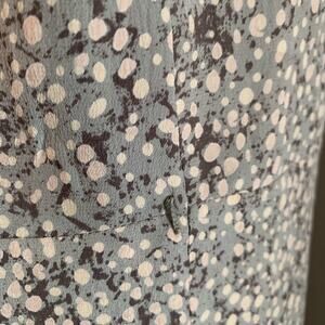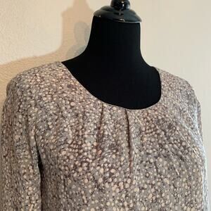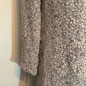 Soun taupe and gray splatter design silk dress. Mid length sleeves. Pleats at neckline. Side zipper. Fully lined. Size 36 European or 6 US. See measurements below. Excellent preowned condition. 100% silk with polyester lining.