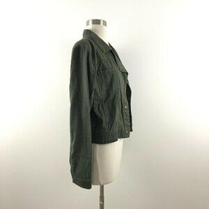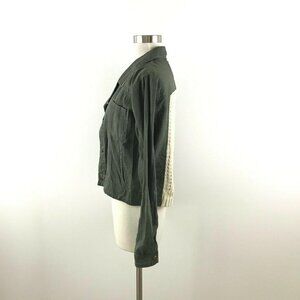 Army Green Utility Jacket with Cream Crochet Back Panel. Long Sleeve. Snap Front. Collar. Chest Pockets.