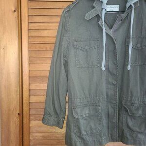 Style: utility, multiple pockets, hood, NOT full length sleeves (looks like slightly shorter sleeve length)