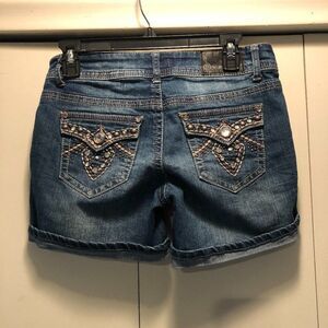 Soundgirl Denim Short Shorts Embellished pockets Size 7 Cuffed Blue....waist size 30", inseam 5"......great condition
