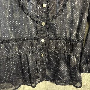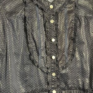 Elevate your wardrobe with this chic black polka dot blouse by . Perfect for any occasion, this top features a stylish design that pairs well with any outfit. This blouse is in great preowned condition. Material and size tag worn off please check measurements slightly sheer