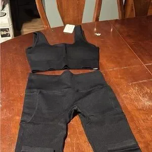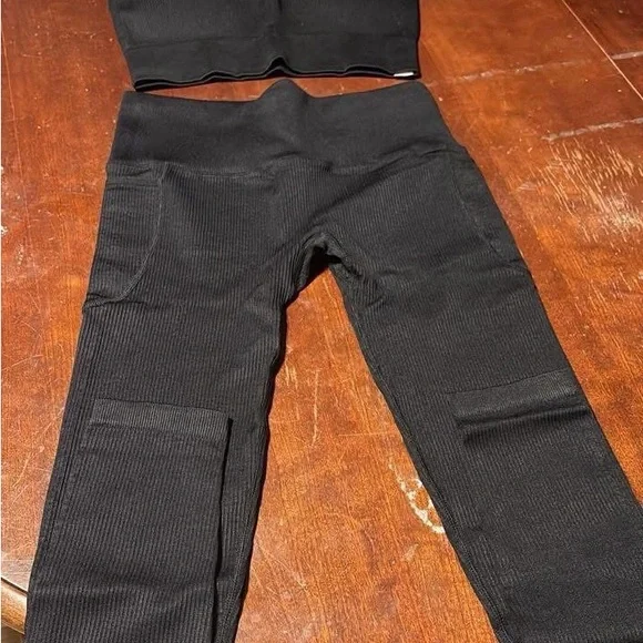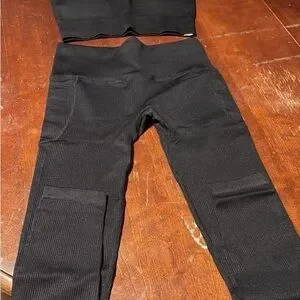 Stylish black ribbed set. Workout outfit Includes top and pants. Comfortable and versatile.