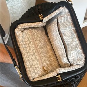 Chic black crossbody bag with woven texture. Stylish and versatile for any outfit.
