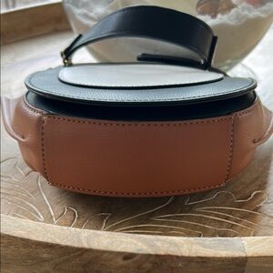 This chic mini bag from Source Unknown showcases a striking black and brown color-blocked design, perfect for adding a contemporary touch to any ensemble. Its unique U-shaped silhouette and structured form make it a standout accessory, while the compact size ensures it remains practical for everyday use.