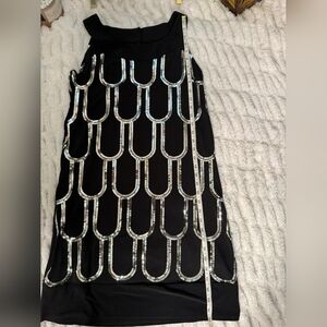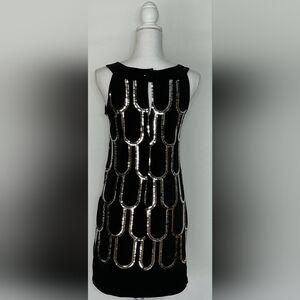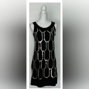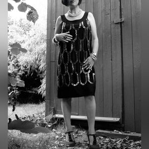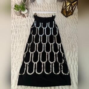 This stunning sleeveless sheath dress features a scoop neckline and is adorned with intricate silver embellishments against a classic black backdrop. Perfect for cocktail parties or a night out, the dress boasts a sophisticated midi length that enhances its elegant silhouette. The art deco-inspired design adds a touch of vintage glamour, making it a standout piece for any special occasion.