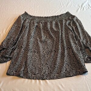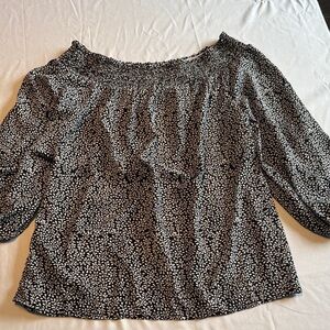 Stylish blouse with intricate black and white pattern. Features a comfortable fit and elegant design.