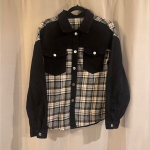 Stylish jean jacket with black and white plaid pattern. Features button closure and chest pockets. Perfect for casual wear.