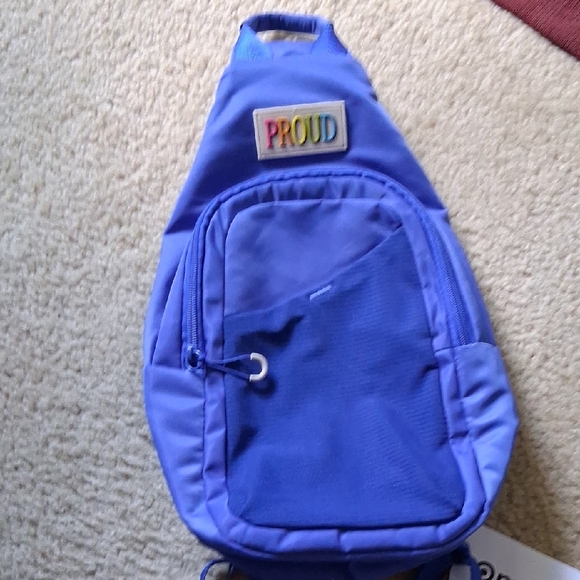 Stylish blue backpack with a front pocket. Features a 'Proud' patch.