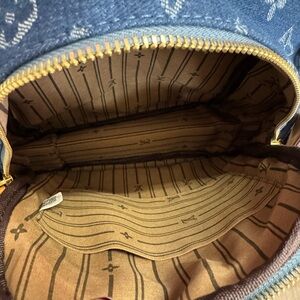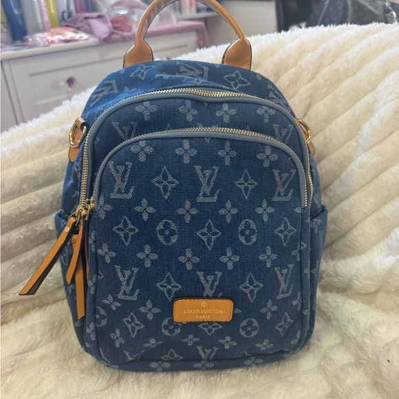 Stylish blue backpack with tan accents. Features a monogram pattern. Compact and functional design.