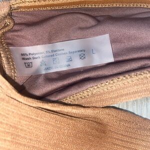 Two-piece ribbed bikini in warm brown. Strapless bandeau top with knot front. High-cut bikini bottoms. Soft textured fabric. Beach-ready and stylish.