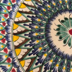Vibrant decorative plate with intricate patterns. Features blue, green, yellow, and red accents. Perfect for display.
