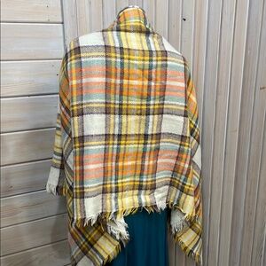 Vibrant plaid scarf with fringe. Perfect for adding color to any outfit.