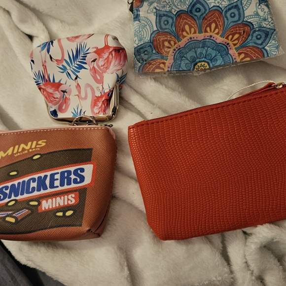 Set of four stylish wallets. Includes vibrant patterns and textures. Perfect for organizing essentials.