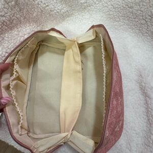 Elegant pink cosmetic bag with a textured finish. Features a sturdy handle and secure zipper closure.