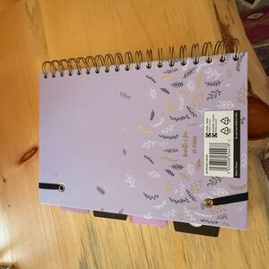 Elegant purple notebook with gold leaf design. Features spiral binding and elastic closure. Ideal for home office use.
