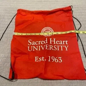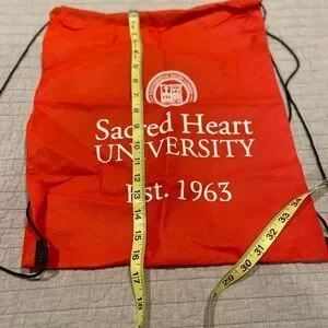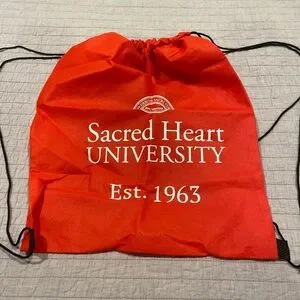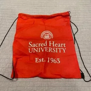 Bold red backpack with white text. Features drawstring closure. Easy to carry.
