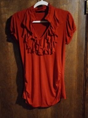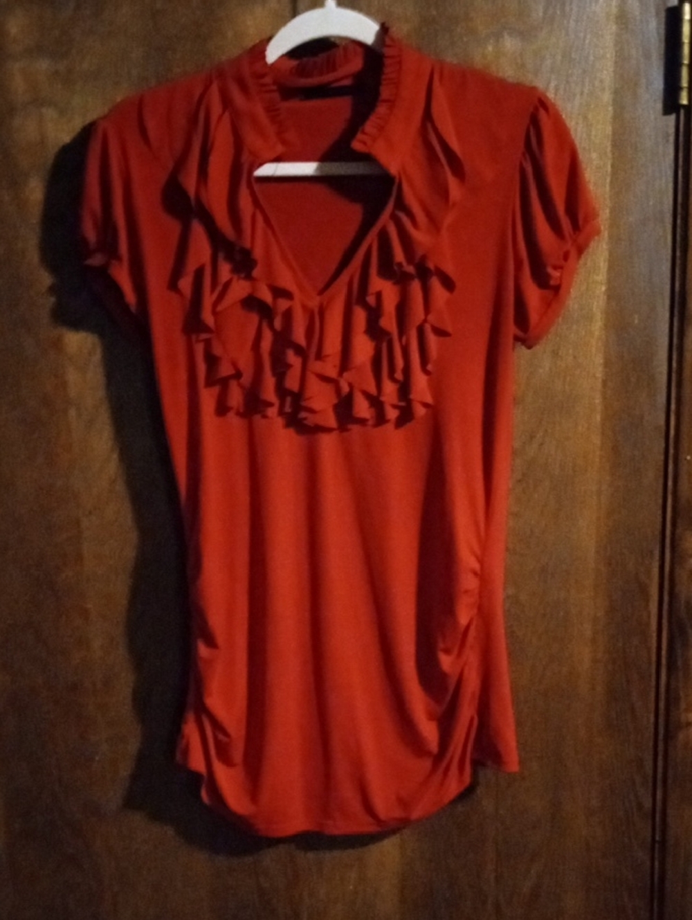 Bright red blouse with layered ruffle trim at the V-neck. Short sleeves and soft drape. Feminine detail and easy pairing with skirts or jeans.