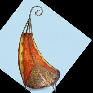 Unique lamp with a curved design. Features red and gold panels. Intricate patterns on the base.