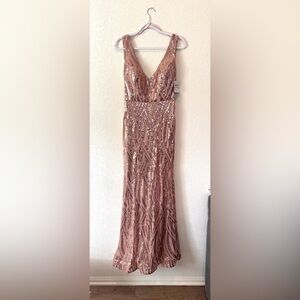 Elegant rose gold dress with sequins. Sleeveless design. V-neckline. Floor-length style.