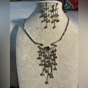 Dazzling necklace set with vibrant gemstones. Features silver finish and colorful accents. Ideal for elegant occasions.