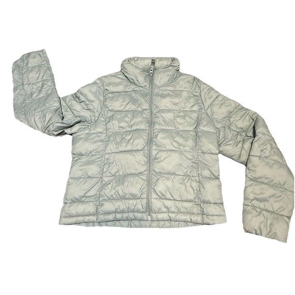 Stylish silver puffer jacket. Lightweight and warm. Perfect for cold weather.