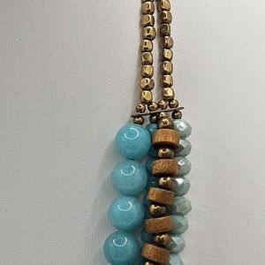 Chic multi-strand necklace with turquoise and gold beads. Perfect for any occasion.