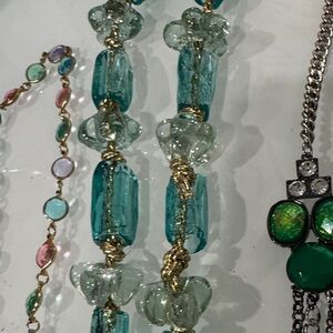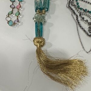 Vibrant turquoise beads with gold tassel. Silver chains with green accents. Perfect for layering.