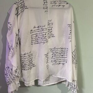 Chic white blouse with script design. Features elegant ruffles. Ideal for stylish ensembles.