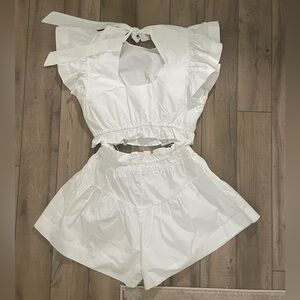 Chic two-piece set with ruffle sleeves. Features a tie-back top and elastic waist shorts. Perfect for casual outings.