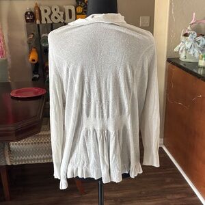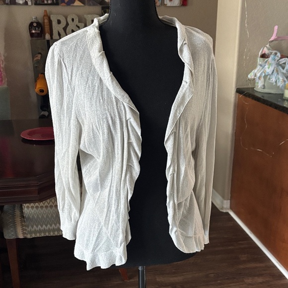 Elegant white shrug with ruffled edges. Lightweight and stylish. Perfect for layering. this is a very light shrug. It is silver with little silver glitter in it. U-27