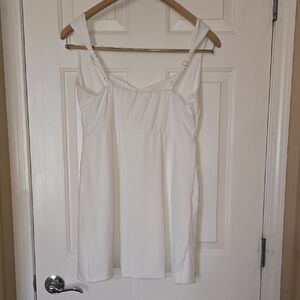 This elegant white mini dress from Source Unknown features a chic sheath silhouette and a sophisticated wide v-neckline, wide elegant straps, and is in a babydoll-ish Fit and Flair cut... Hugs the breast then flows Perfect for cocktail events or as a wedding guest, its sleeveless design offers a timeless and versatile look. The minimalist style ensures a sleek and polished appearance for any special occasion. This dress is stretchy and will hug your curves in all of the right ways.