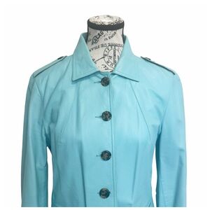 In a stunning aqua blue with contrasting brown lining, five round buttons down the front offer closure. Epilates with a button on each shoulder add to the appeal.