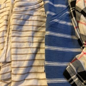 Set of 5 blouses with a bold plaid pattern a solid black contrast, blue stripes, beige stripes and all ivory blouse. Perfect for any outing. The black top is new with tags, new price for that one was $89.