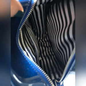 Ahoy Matey! Instantly cute-ify any outfit with our Ship Shape Purse in a super, sparkly, deep blue glitter vinyl! The front features a sweet white vinyl bow and the inside is lined in black and white satin with a zip pocket perfect for keeping small, loose items contained. The strap is a nice, generous length making it perfect for throwing over your shoulder and heading out to a fun event!