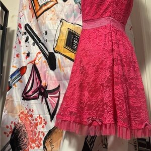 Sourpuss dress- worn once and no imperfections- cute bows detail the bottom skirt as well as the front pockets, dress made of a soft net and lace in the color fuchsia/ pink- back zipper for closure- sleeveless- size large! Happy poshing!