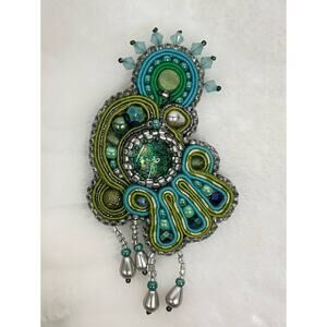 Soutache & Beaded Embroidered Green Blue Pendant Pin by Amee Runs with Scissors