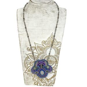 Soutache & Beaded Embroidered Purple Blue Pendant Necklace by Amee Runs with Scissors